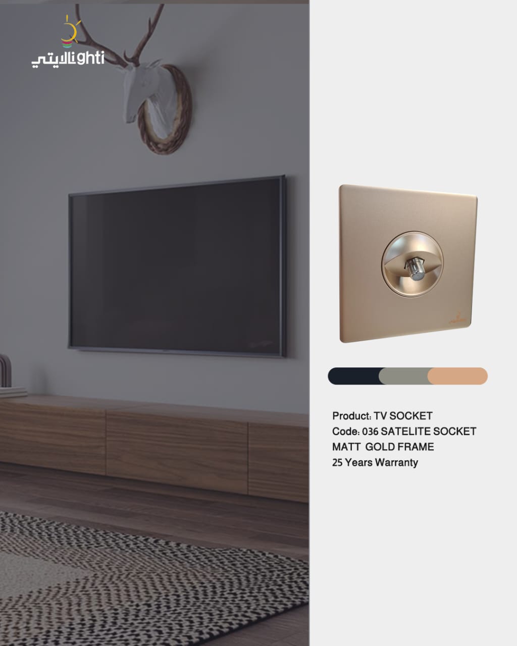 Satellite Socket Matt Gold هو مقبس مصمم لتوصيل أسلاك الأقمار الصناعية (Satellite cables) في الأماكن التي تحتاج إلى استقبال إشارات القنوات الفضائية. يأتي هذا المقبس بتصميم عصري مع لمسة نهائية Matt Gold (ذهبي غير لامع)، مما يضيف لمسة من الأناقة والرفاهية لأي مساحة. إليك تفاصيل هذا المنتج: