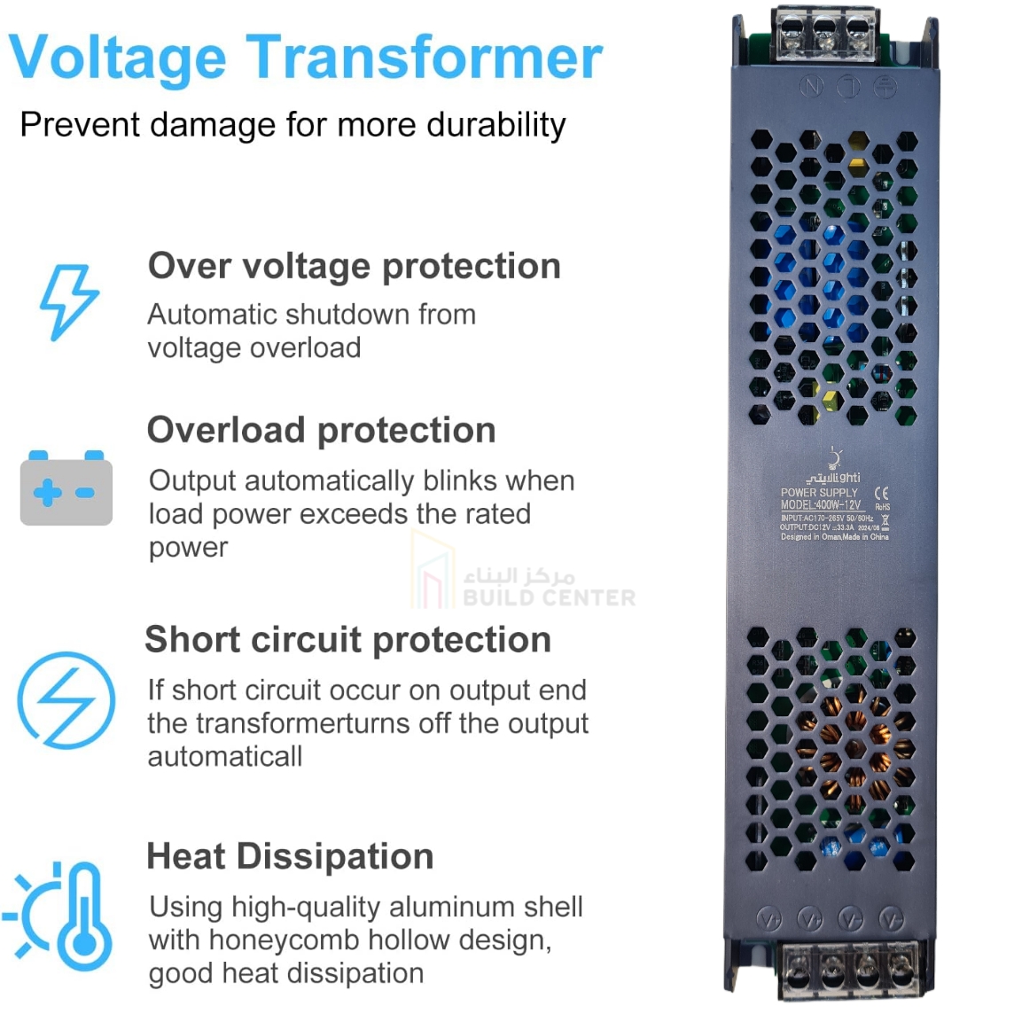 مصدر الطاقة 12 فولت DC بقدرة 400 واط هو خيار ممتاز لتوفير طاقة موثوقة وآمنة للأجهزة التي تتطلب طاقة أكبر، مما يجعله مثاليًا للعديد من التطبيقات التي تتطلب إمداد طاقة مستمرًا ومستقرًا.