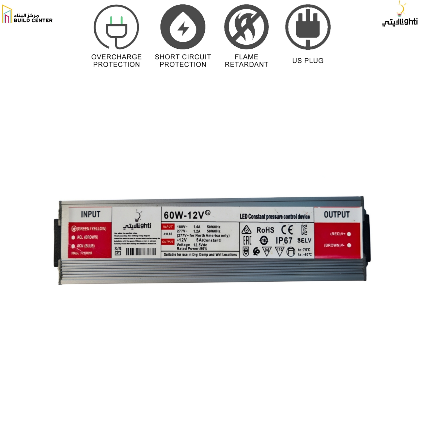 - الحماية: حماية من التيار الزائد، الفولتية الزائدة، والحرارة الزائدة